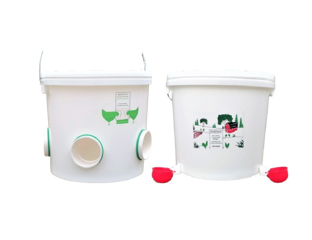 🐥 Il set include (1) Mangiatoia da 18l con 5 coperture per le aperture di alimentazione, (1) Abbeveratoio da 18l.