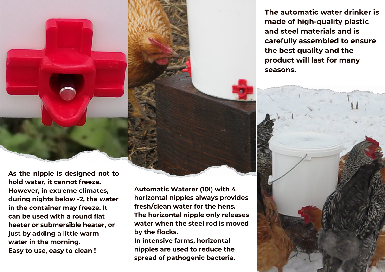 Il beccuccio per galline è più duraturo e fornisce sempre acqua fresca al tuo pollame, mantenendo l’acqua libera da sporco e deiezioni.
