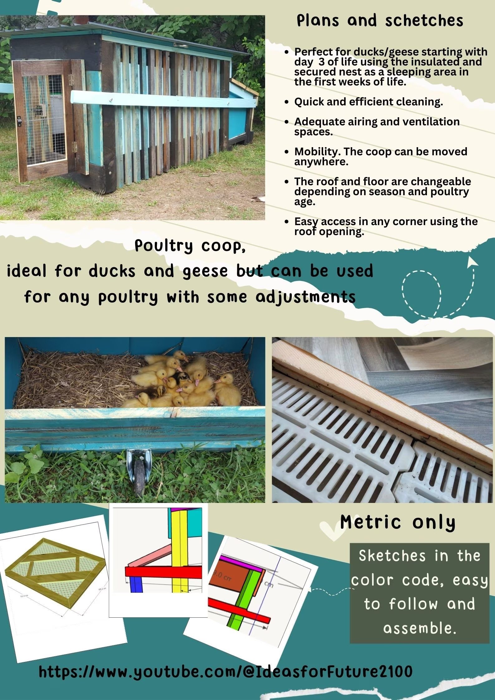 Questo innovativo recinto mobile, ispirato alla permacultura, garantisce una pulizia semplice grazie al deflusso naturale del letame, creando un ambiente igienico e confortevole. Con dimensioni di 140×100 cm, può ospitare fino a 15 anatre ed è dotato di raccolta uova esterna, pavimento sicuro e ventilazione ottimale. La guida di 15 pagine include piani adattabili, schizzi dettagliati e supporto per il montaggio via e-mail.